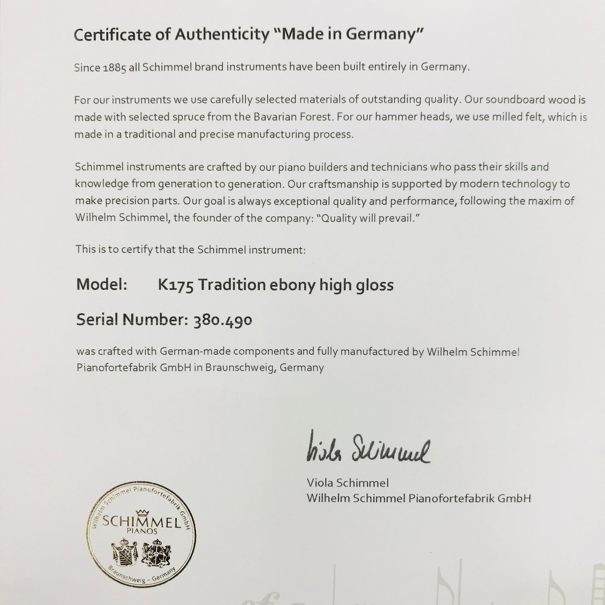 In the over 130 years since their founding, Schimmel has never lost sight of its principles: quality, innovation, beauty, and passion. It's all on fierce display in the Schimmel Konzert K175 Grand Piano. From the hammer produced by Wurzen (in a procedure even Schimmel brand "pedantic") to the Triplex Scaling, this is a piano for the ages.
