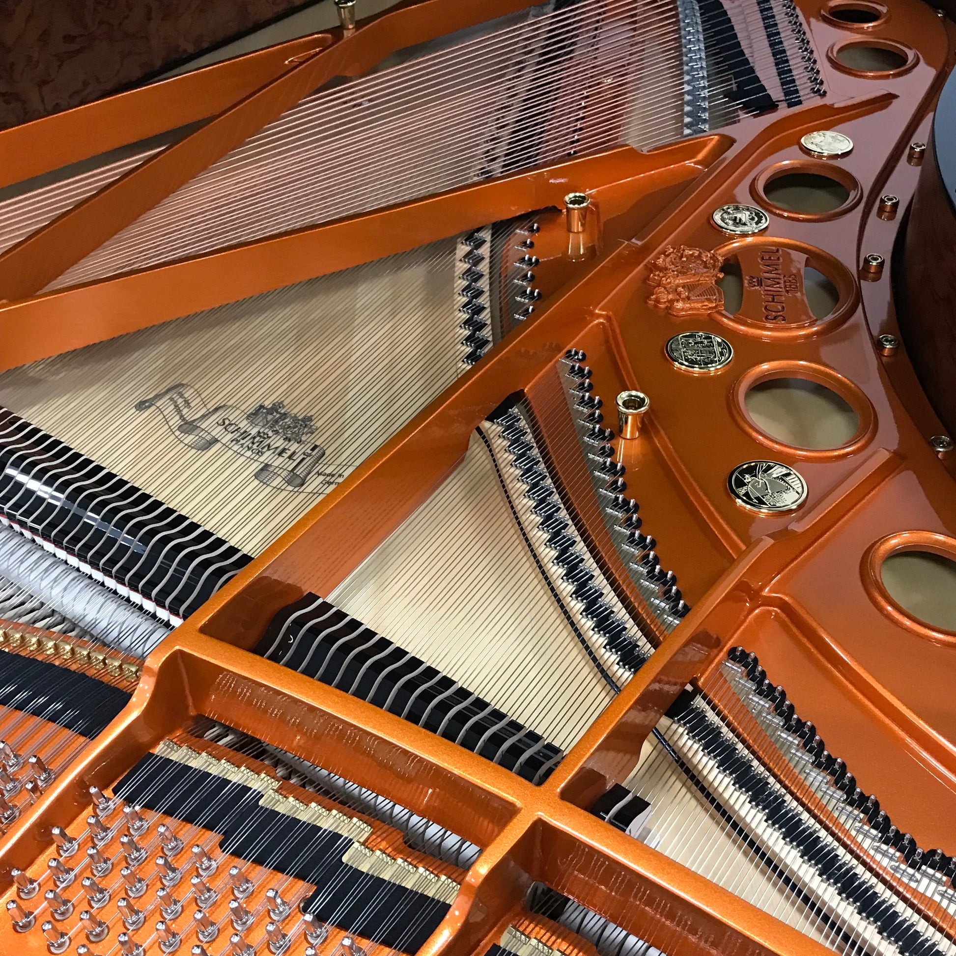 In contrast to the traditional Schimmel brightness, the Konzert is dark and brooding – decidedly unique among the German maker's repertoire. A new bridge design allows the soundboard to vibrate more liberally, and an additional string is added in the mid and treble to extend the speaking length: known as "triplex scaling."