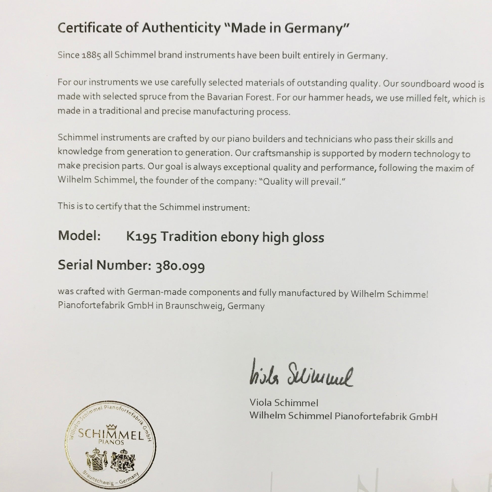 Designed in Braunschweig by Schimmel and constructed by Renner, another German company, the K195's action is remarkable. Beautifully responsive and expressive, the action delivers the subtle nuances you expect of the best grand pianos; and the mineral and ebony keytops provide a natural feel.